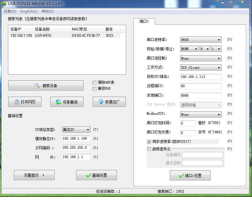 串口服務(wù)器USR-N510網(wǎng)線和電腦直連,IP設(shè)置同網(wǎng)段,在電腦用M4設(shè)置軟件去搜索USR-N510的IP,設(shè)置USR-N510的參數(shù),做TCP client。遠(yuǎn)程服務(wù)器地址填電腦IP,遠(yuǎn)程端口填電腦server端口。