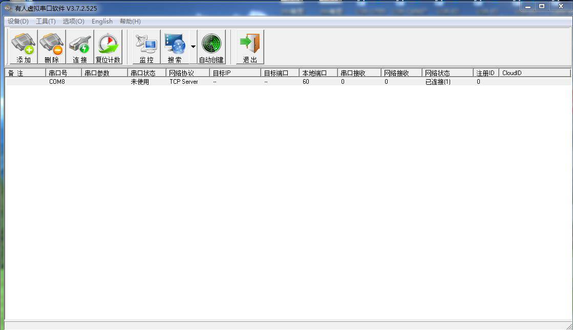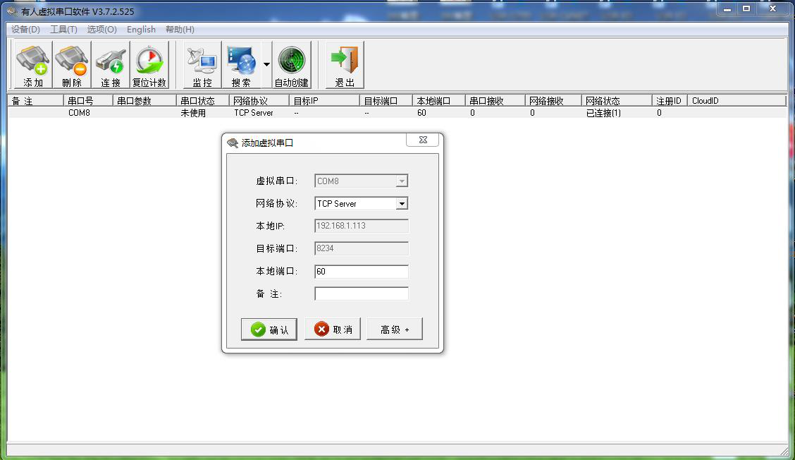 電腦用虛擬串口軟件建立一個(gè)虛擬串口COM8,做TCP server,服務(wù)器,本地端口60。
