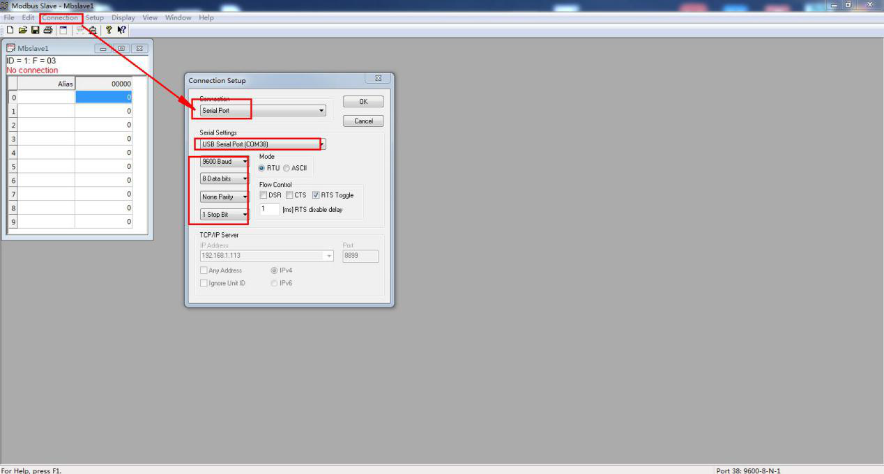 USB-RS232或者USB-RS485串口線接USR-N510串口和電腦USB口,MODBUS SLAVE軟件打開COM口,模擬客戶串口MODBUS RTU設(shè)備。USR-N510網(wǎng)線和電腦直連,IP設(shè)置同網(wǎng)段,在電腦安裝USR-VCOM虛擬串口軟件和組態(tài)王。模擬調(diào)試,用組態(tài)王連接串口服務(wù)器,去讀取串口設(shè)備數(shù)據(jù)。