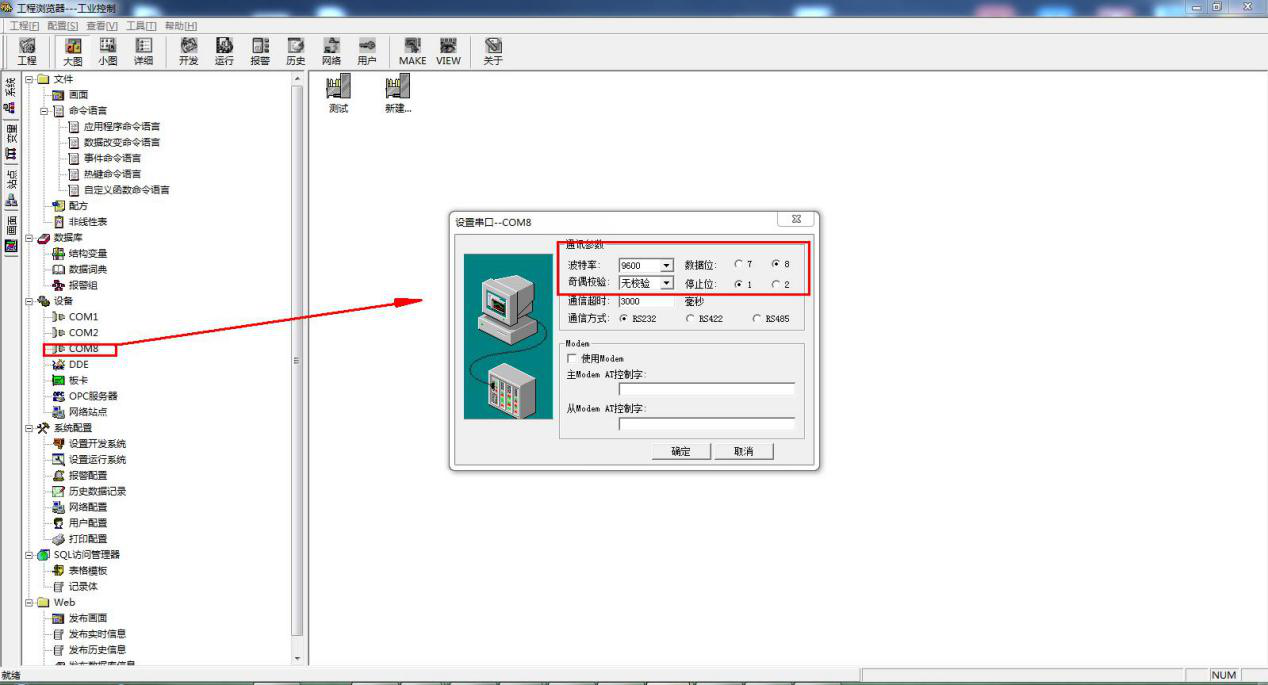 點(diǎn)擊設(shè)備,新建一個(gè)組態(tài)設(shè)備,選擇 Modbus RTU 標(biāo)準(zhǔn)協(xié)議的莫迪康 PLC。 下一步,選擇使用虛擬串口 COM8,下一步輸入設(shè)備ID 1。點(diǎn)擊新建的COM8設(shè)備,還可以修改串口參數(shù),設(shè)置和USR-N510的串口參數(shù)一致。通訊方式可以根據(jù)串口設(shè)備,選擇RS232或者RS485。