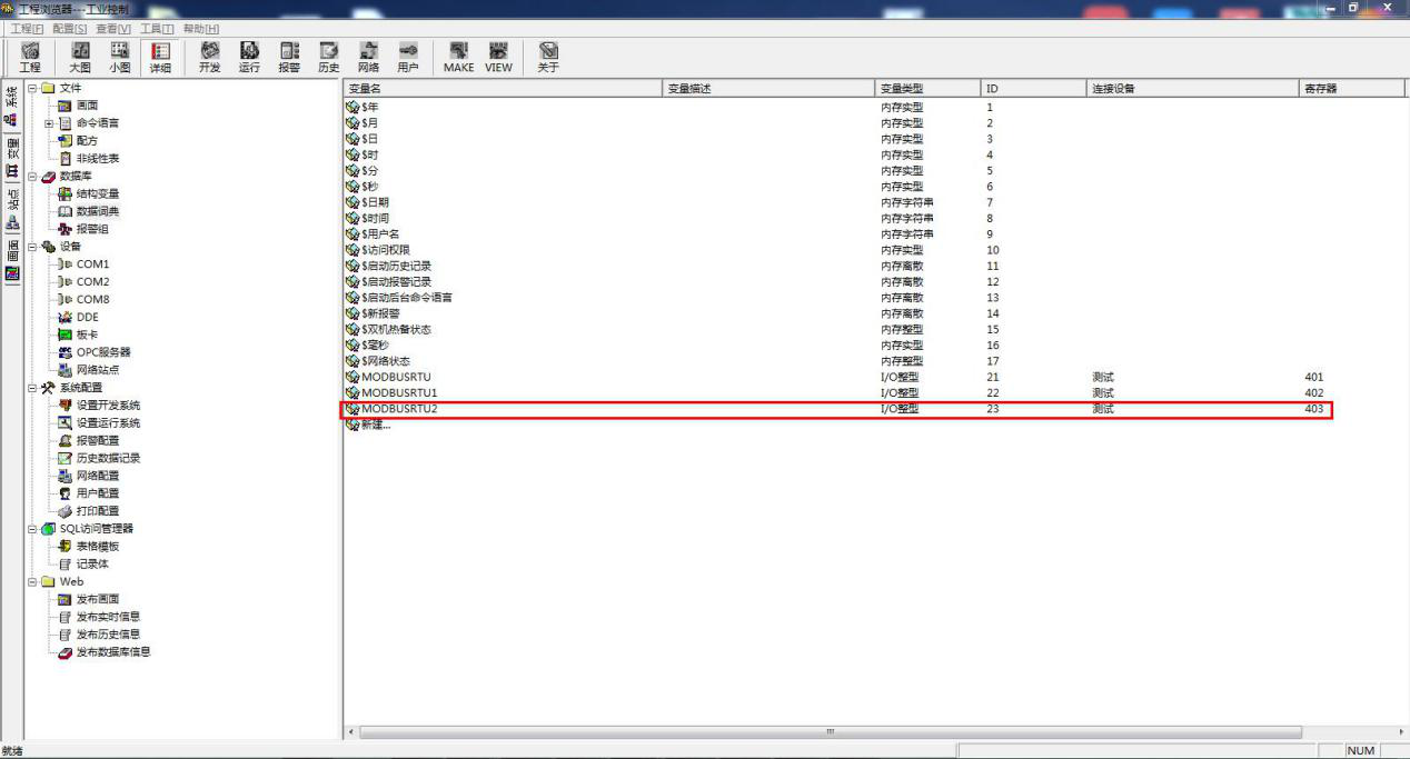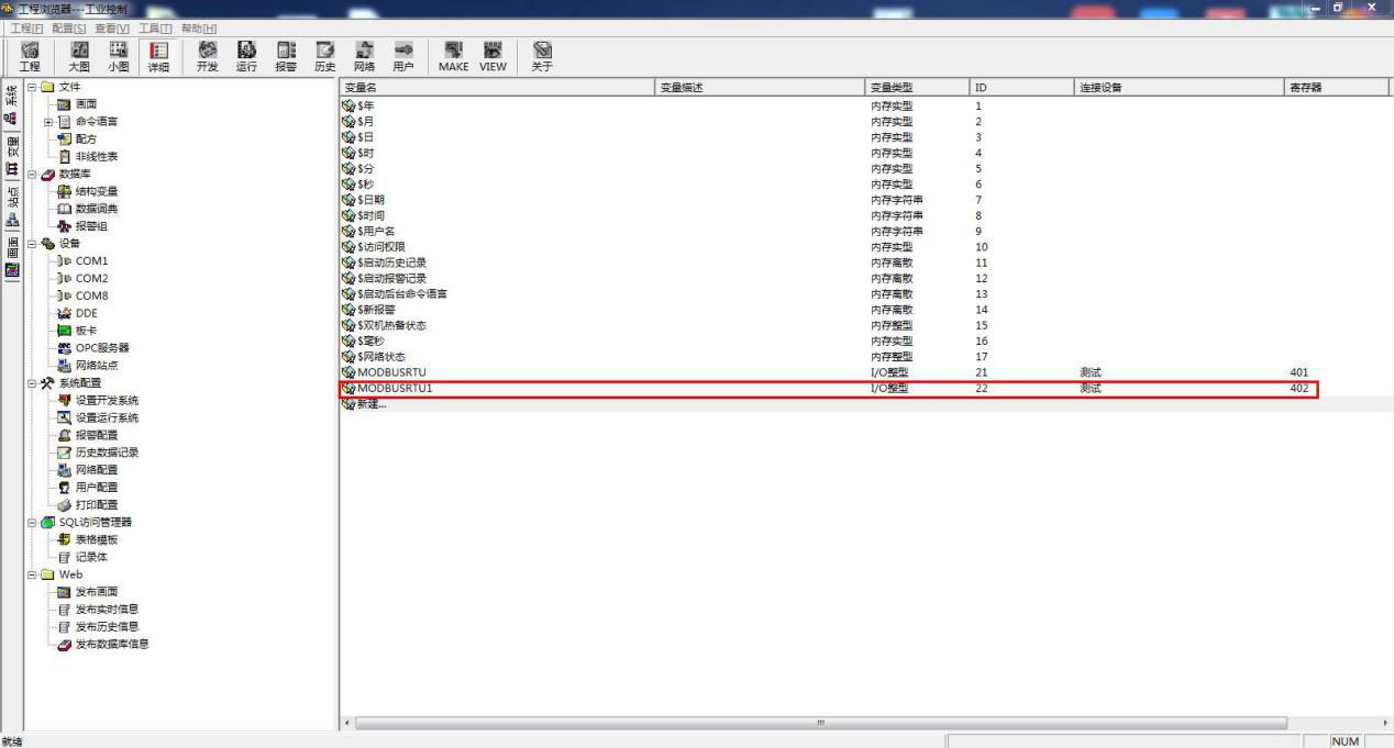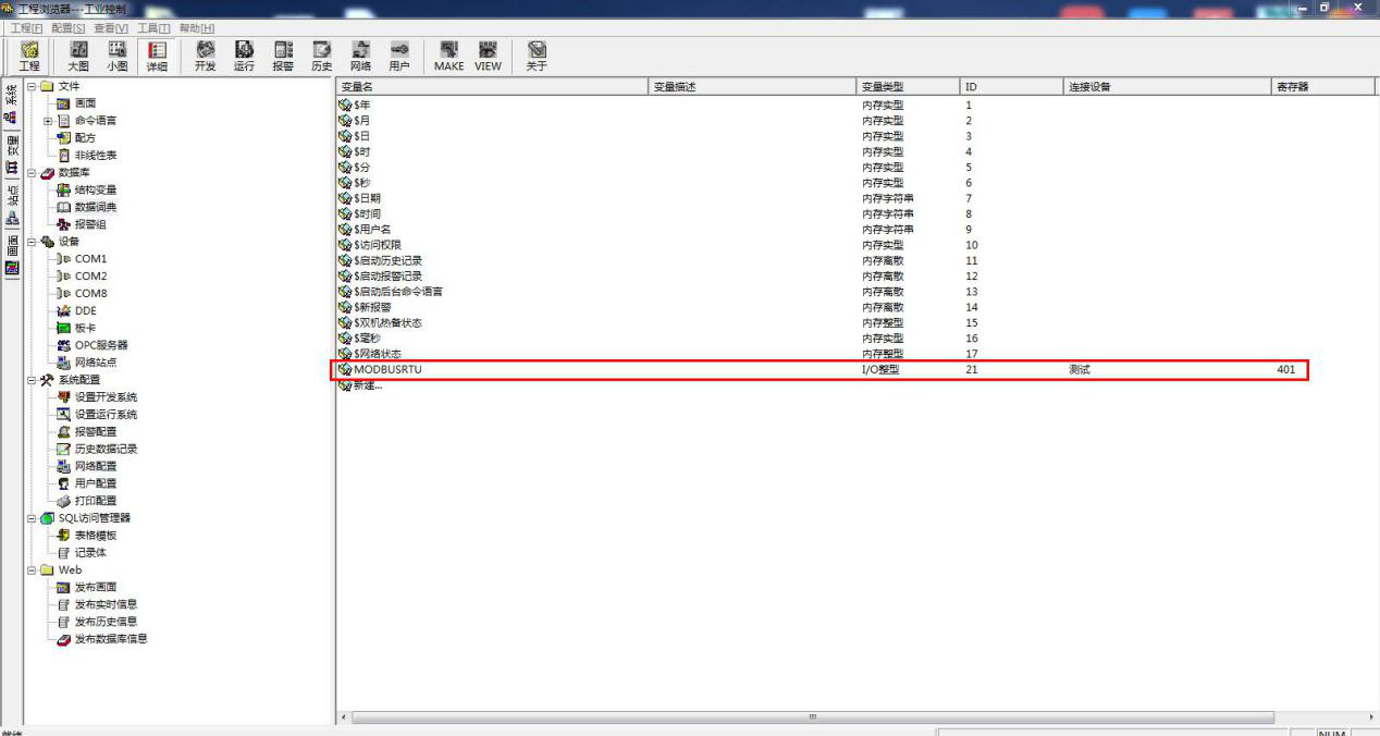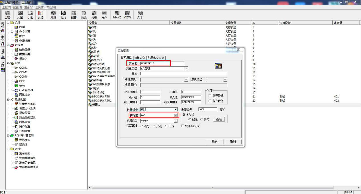 新建變量名 MODBUSRTU,選擇變量類型 IO 整數(shù)。連接設(shè)備為新建的設(shè)備 名:新建 IO 設(shè)備,寄存器 401,代表功能碼為 03,起始地址 0 的第一個(gè)值