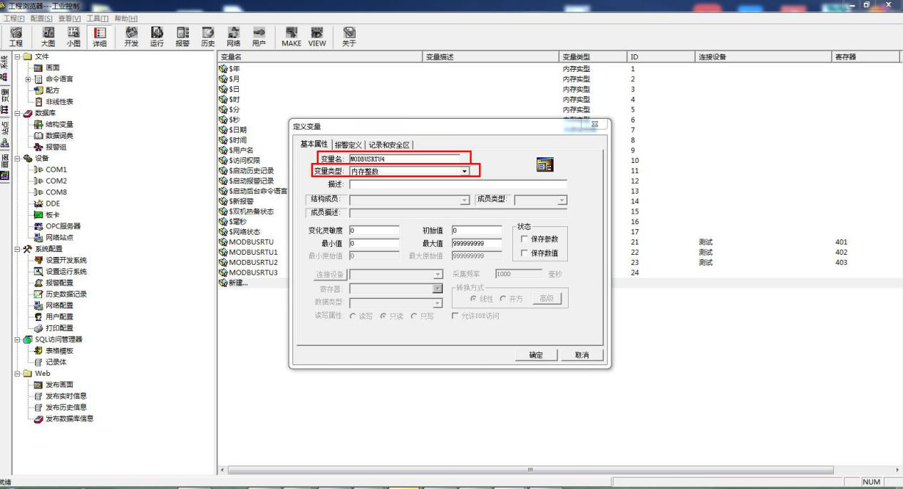 新建變量名 MODBUSRTU4,選擇變量類型內(nèi)存整數(shù)。
