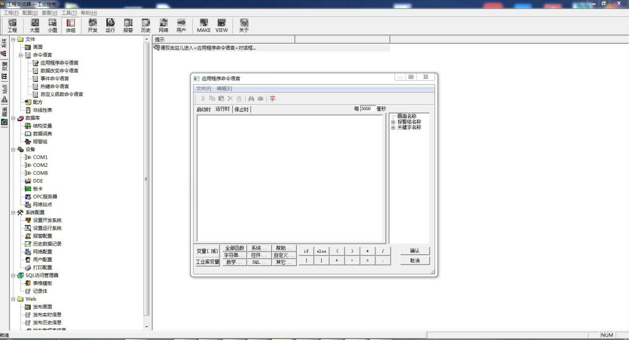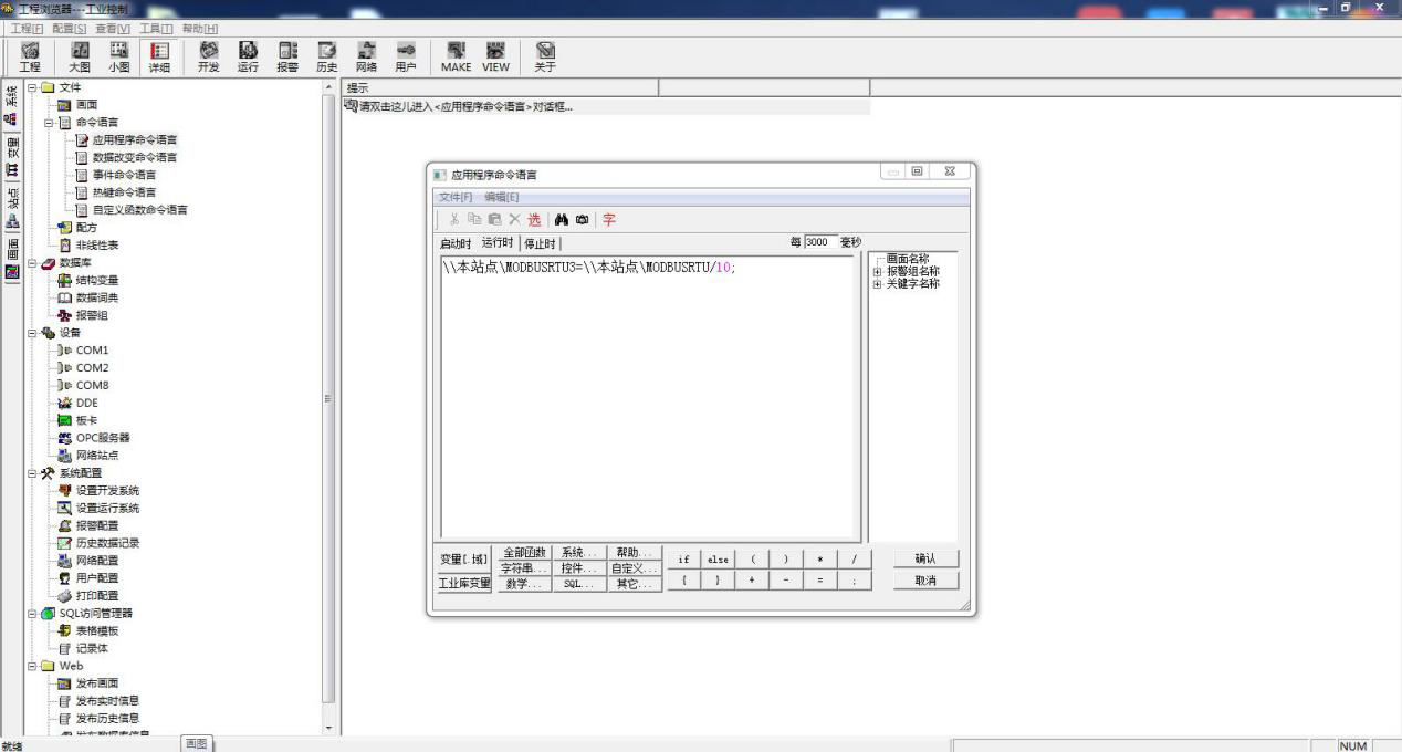 選擇命令語言的應(yīng)用程序命令語言。然后輸入算法,MODBUSRTU 變量名 采集到的數(shù)據(jù)除以 10,然后將數(shù)據(jù)賦值給 MODBUSRTU3,此變量對(duì)應(yīng)的是實(shí) 際的串口設(shè)備寄存器0地址中數(shù)據(jù)值。MODBUSRTU1 變量名采集到的數(shù)據(jù)除以 10,然后將數(shù)據(jù)賦值給 MODBUSRTU4,此變量對(duì)應(yīng)的是實(shí) 際的串口設(shè)備寄存器1地址中數(shù)據(jù)值。MODBUSRTU2 變量名采集到的數(shù)據(jù)除以 10,然后將數(shù)據(jù)賦值給 MODBUSRTU5,此變量對(duì)應(yīng)的是實(shí) 際的串口設(shè)備寄存器1地址中數(shù)據(jù)值。