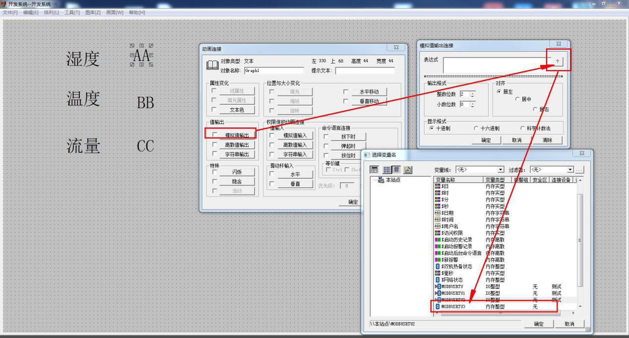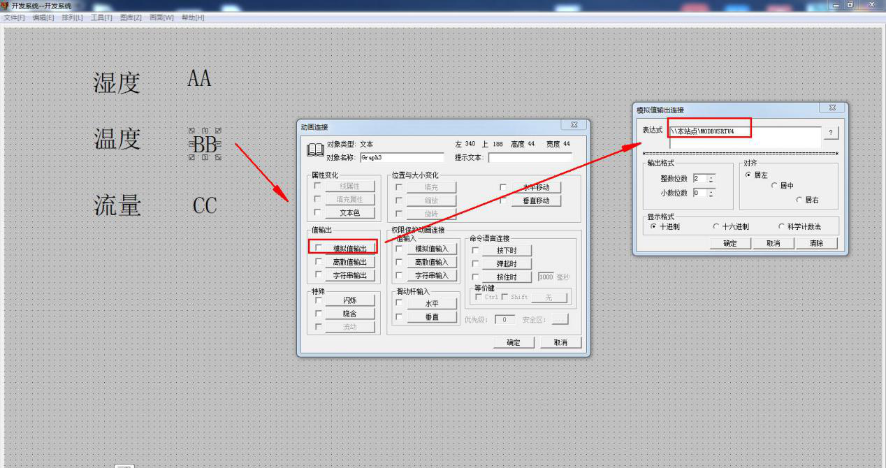 雙擊其中一個(gè)文本 BB,然后點(diǎn)擊模擬值輸出,在表達(dá)式內(nèi)選擇變量名 為 MODBUSRTU4,然后確定。意思是 MODBUSRTU4 的值是設(shè)備寄存器地址1中的數(shù)據(jù)值,然后將數(shù)值 傳到畫面BB
