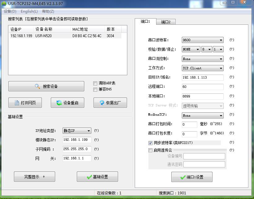 USR-N520網(wǎng)線和電腦直連,IP設(shè)置同網(wǎng)段,在電腦用M4設(shè)置軟件去搜索USR-N520的IP,設(shè)置USR-N520的參數(shù),做TCP client。遠(yuǎn)程服務(wù)器地址填電腦IP,遠(yuǎn)程端口填電腦server端口。