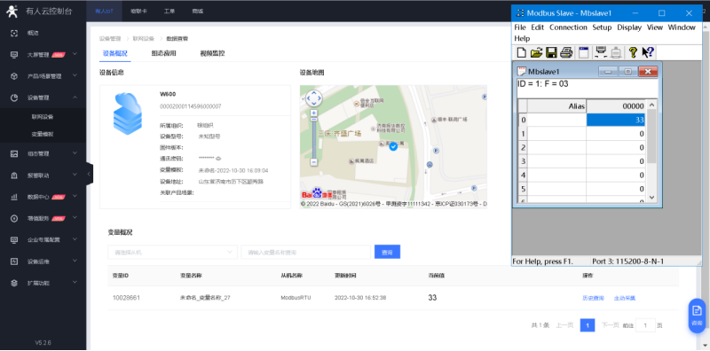 1、本次測試用modbus slave模擬,從機(jī)號1,功能碼03,W600設(shè)置與之一致的串口參數(shù),在對應(yīng)的寄存器填寫一個數(shù)值,本次測試數(shù)值寫入33.
