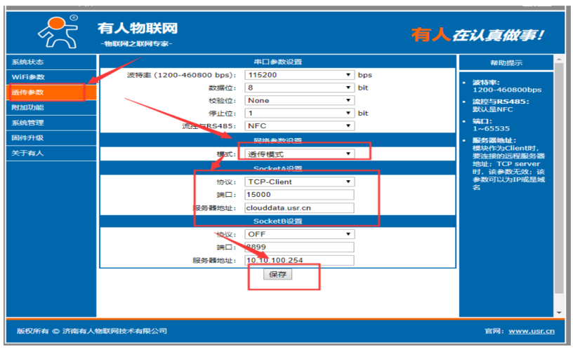 1、電腦鏈接w610的WiFi,在瀏覽器中輸入設(shè)備默認(rèn)的ip:10.10.100.254進(jìn)入內(nèi)置網(wǎng)頁。內(nèi)置網(wǎng)頁的賬號密碼都是admin。進(jìn)入透傳參數(shù),選擇透傳模式,SOCKET A設(shè)置協(xié)議為TCP client 服務(wù)器地址:clouddata.usr.cn端口15000點擊保存