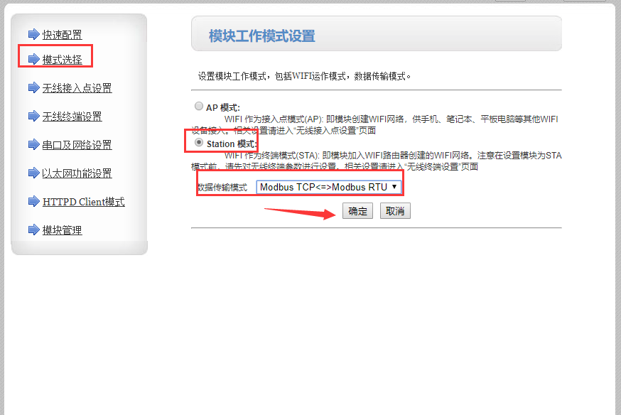 4、模式選擇: STA,modbus rtu<=>modbus tcp協議轉換。 注:確定后,不用立刻重啟,等著全部修改完成一塊重啟。