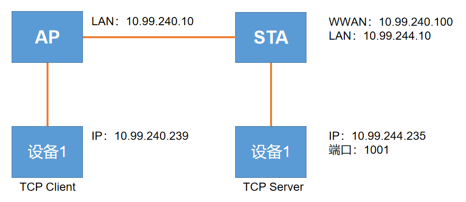 sta路由器下的子網(wǎng)設(shè)備設(shè)置靜態(tài)IP,如10.99.244.235,并開(kāi)啟監(jiān)聽(tīng)。(實(shí)際設(shè)備如果是PLC等設(shè)備要確認(rèn)IP的設(shè)置和通信監(jiān)聽(tīng)端口)。