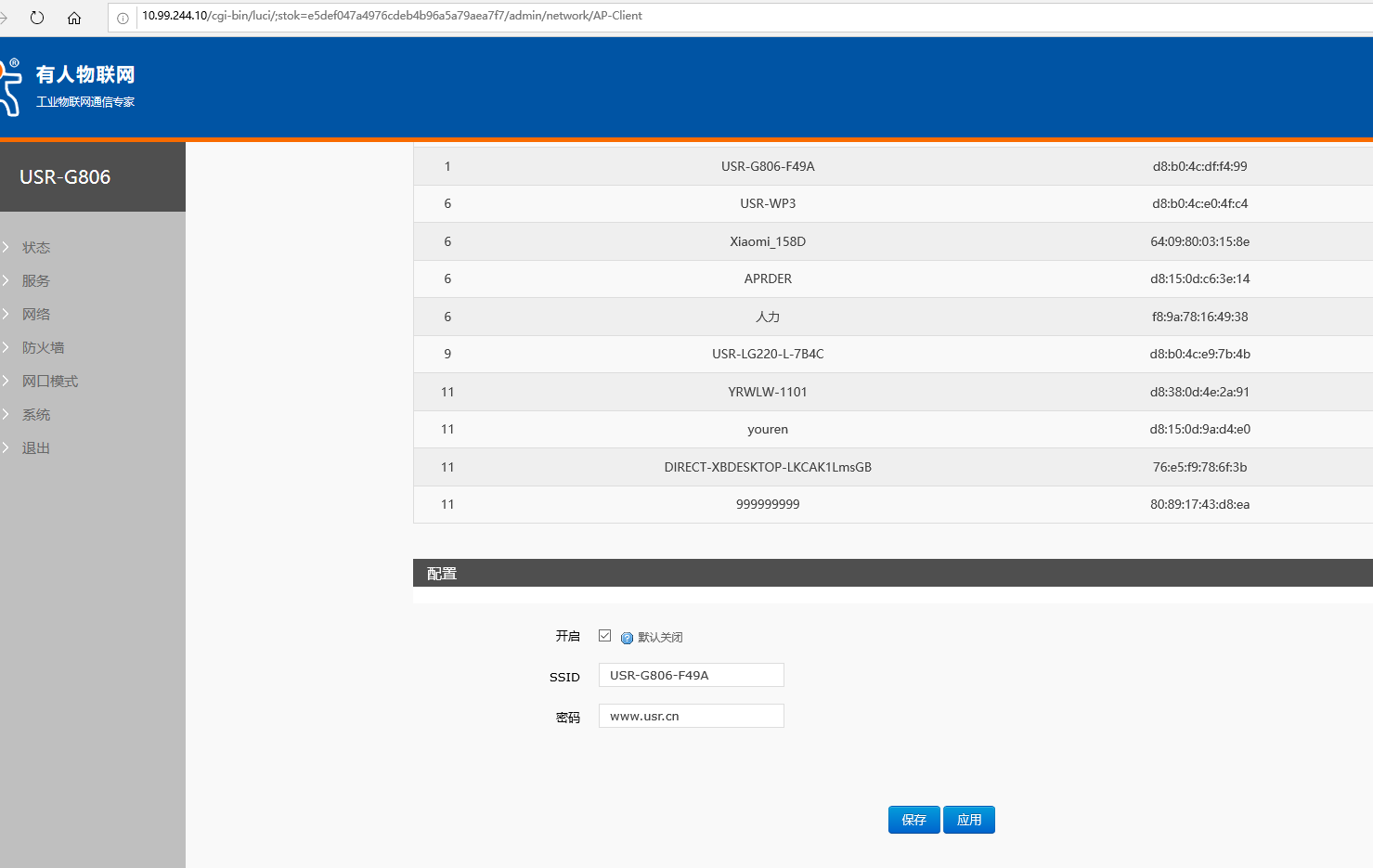 進(jìn)入網(wǎng)絡(luò)----無(wú)線客戶端功能界面,勾選“開(kāi)啟”,在上方列表中找到對(duì)應(yīng)的AP的SSID(列表右側(cè)對(duì)應(yīng)該AP信號(hào)強(qiáng)度,100為最強(qiáng)。),將AP的SSID和密碼正確填寫(xiě),然后點(diǎn)擊保存,應(yīng)用。