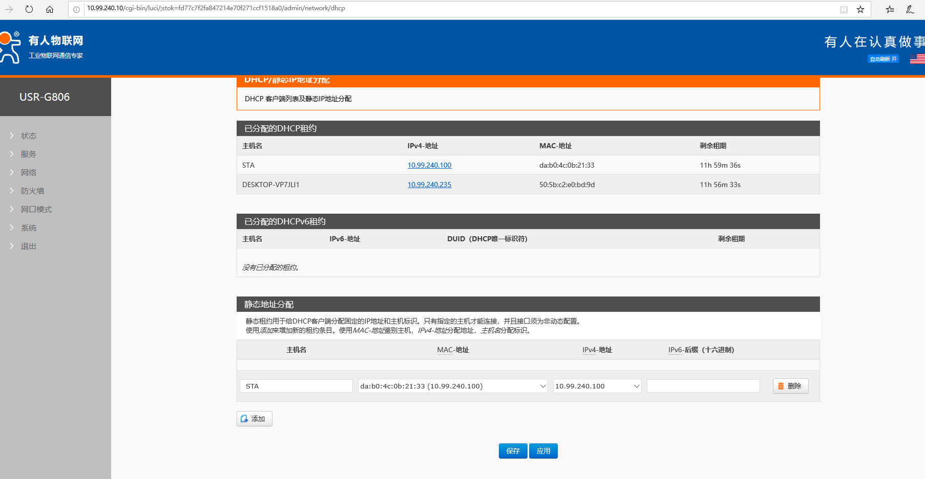 在ap路由器進(jìn)入網(wǎng)絡(luò)----DHCP/DNS界面,設(shè)置mac綁定,為sta設(shè)備設(shè)定wwan口固定IP,比如10.99.240.100。設(shè)置完之后保存應(yīng)用,重啟設(shè)備