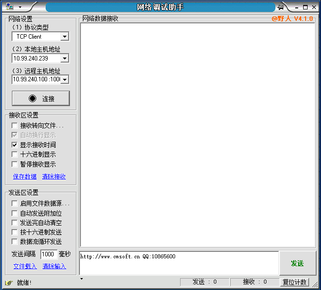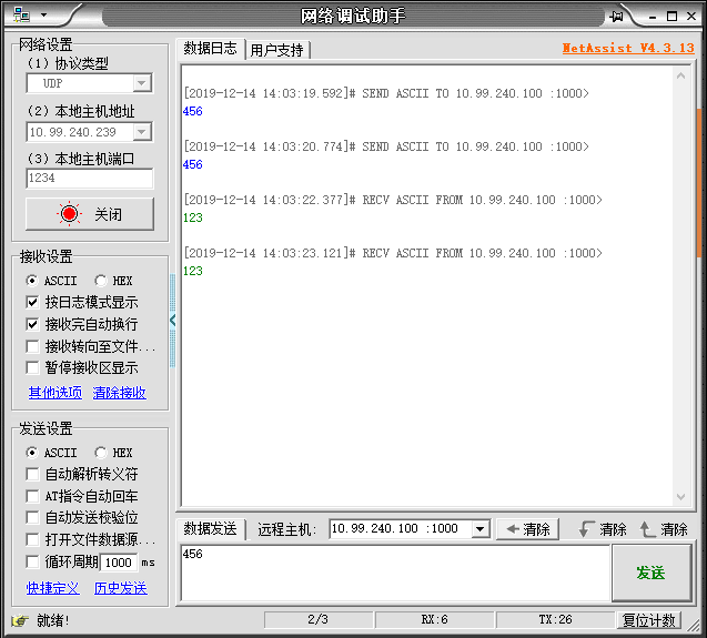 Ap下設(shè)備也更改為UDP協(xié)議,遠(yuǎn)程主機(jī)的IP就是sta路由器的WWAN口IP地址10.99.240.100,端口是映射的外部端口1000,設(shè)置完后發(fā)送數(shù)據(jù),sta下的設(shè)備就能夠識(shí)別到數(shù)據(jù)來(lái)源,然后實(shí)現(xiàn)雙向數(shù)據(jù)傳輸: