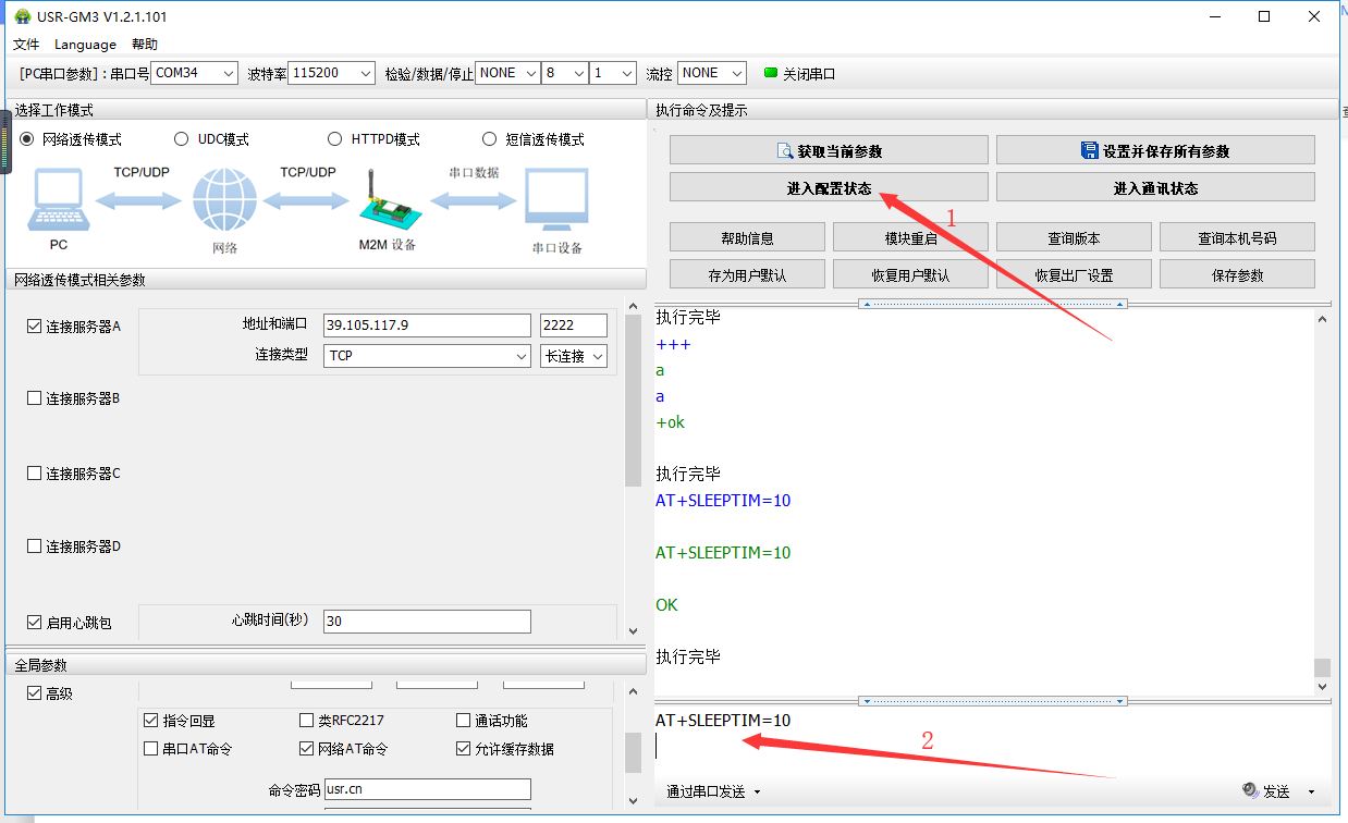 將模塊重啟之后,10秒鐘這個(gè)10秒鐘的無數(shù)據(jù)收發(fā)定時(shí)仍然生效,只有進(jìn)入配置狀態(tài),將AT+SLEEPTIM的值設(shè)置為0,并且保存參數(shù)重啟生效之后,定時(shí)低功耗模式才會解除。