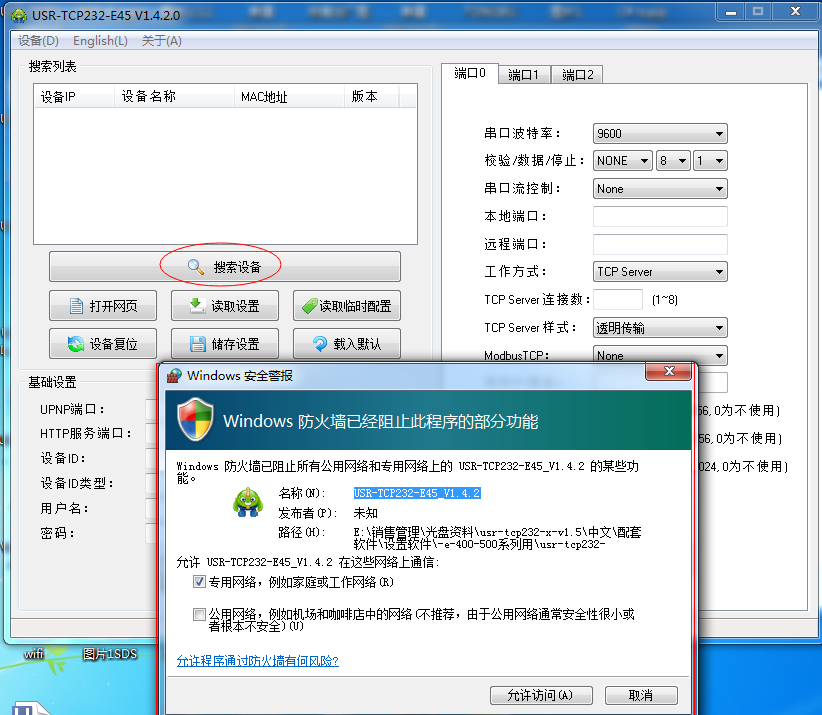1:當(dāng)開(kāi)啟防火墻之后,打開(kāi)USR-TCP232-E45串口服務(wù)器搜索軟件。會(huì)出現(xiàn)防火墻阻止的提示。