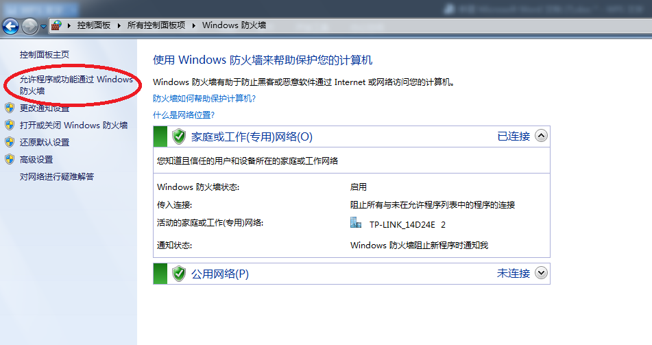 打開(kāi)防火墻,防火墻是開(kāi)啟的,單擊 允許程序或者功能通過(guò)windows防火墻。