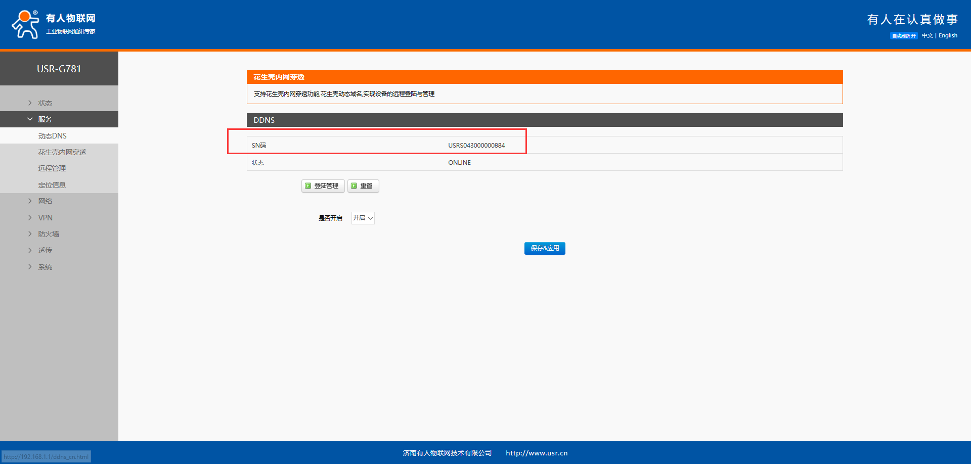1、 啟用花生殼內(nèi)網(wǎng)穿透功能。選擇開啟,點擊保存&應用,等待數(shù)秒,狀態(tài)會顯示ONLINE,并會自動識別到設備的sn碼,即成功開啟