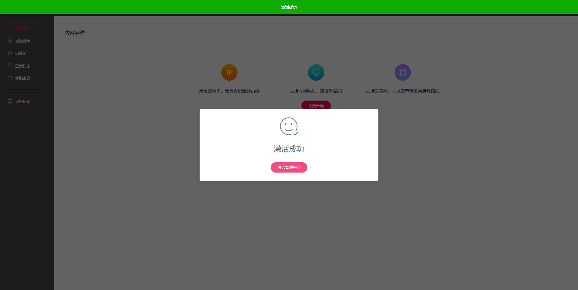 手機端確認激活后,顯示激活成功,點擊進入管理平臺。