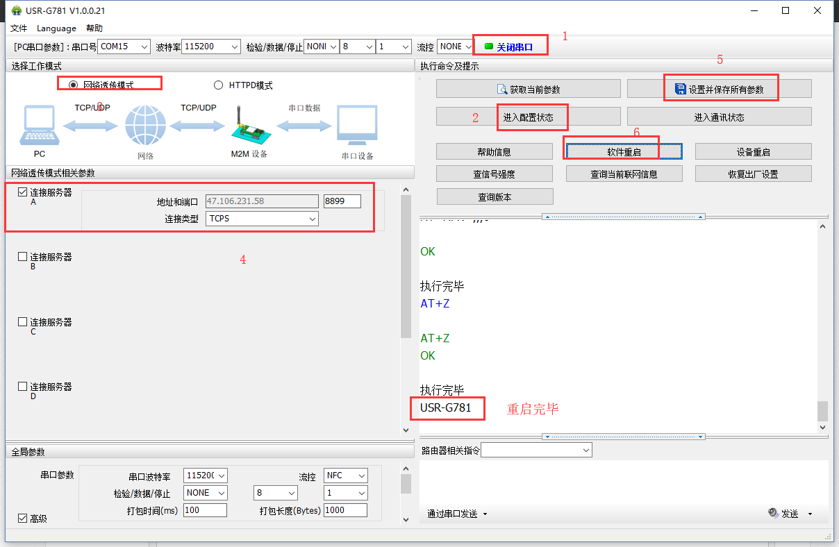 5、通過G781串口設置參數(shù),socketA作為TCPS監(jiān)聽端口