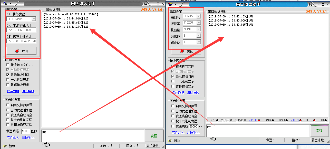 6、在可訪問公網(wǎng)的PC上打開調(diào)試助手,填寫服務器地址和端口(花生殼生成的域名和端口),點擊鏈接,G781的LINKA指示燈亮起;在G781串口鏈接的PC上打開串口調(diào)試助手,在發(fā)送區(qū)發(fā)送數(shù)據(jù),可以看到數(shù)據(jù)的雙向通信: