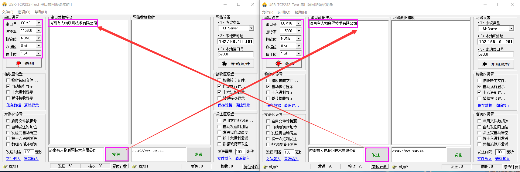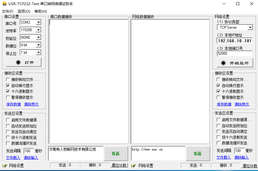 同時(shí)打開(kāi)兩個(gè)串口轉(zhuǎn)網(wǎng)絡(luò)助手軟件。一個(gè)選擇虛擬串口,一個(gè)選擇COM16,即可進(jìn)行收發(fā)測(cè)試。