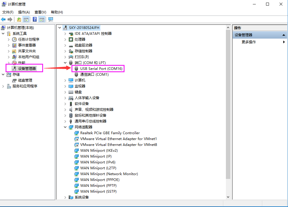 在設(shè)備管理器中查看端口信息,確定410S串口使用的串口號(hào),如下圖所示電腦端口號(hào)為COM16。