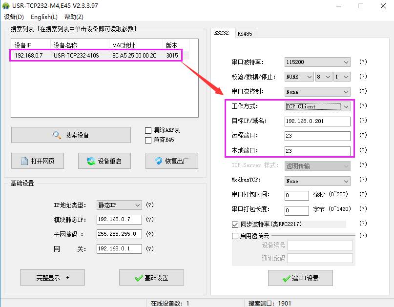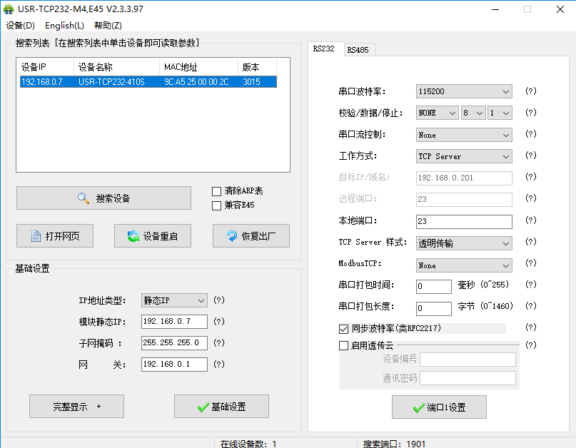 點(diǎn)擊“搜索設(shè)備”,當(dāng)搜索列表中出現(xiàn)410S的設(shè)備后,單擊搜索到的設(shè)備,查看其配置信息(下圖為默認(rèn)配置信息)。