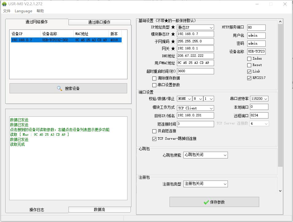 點(diǎn)擊“搜索設(shè)備”,當(dāng)搜索列表中出現(xiàn)302的設(shè)備后,單擊搜索到的設(shè)備,設(shè)置配置信息并保存