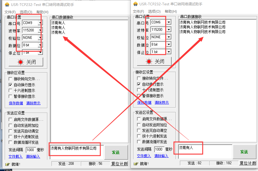 同時(shí)打開(kāi)兩個(gè)串口轉(zhuǎn)網(wǎng)絡(luò)助手軟件。一個(gè)選擇虛擬串口,一個(gè)選擇COM9,即可進(jìn)行收發(fā)測(cè)試