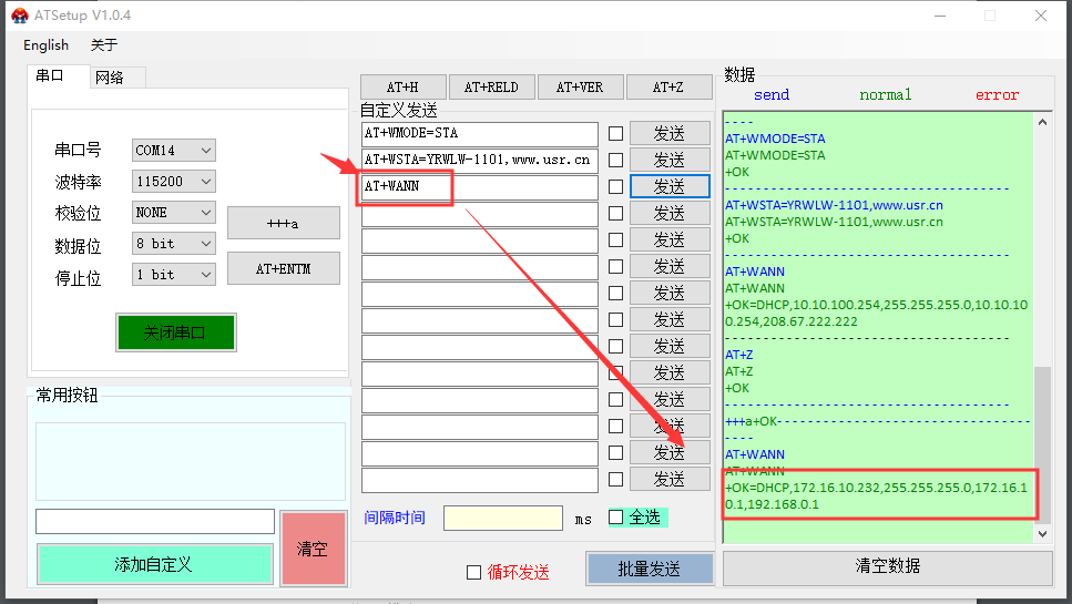 2.使用AT指令:AT+WANN查詢路由器動(dòng)態(tài)分配給設(shè)備的IP