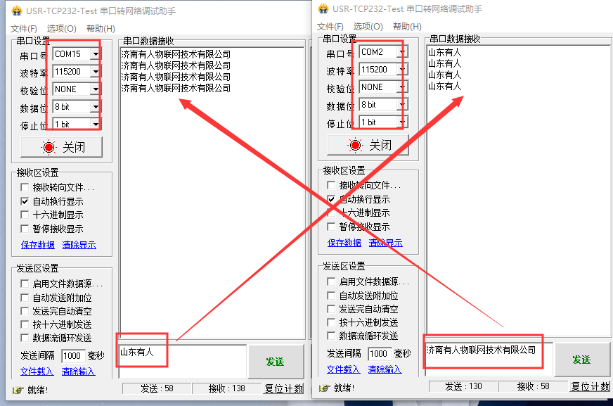 5.同時(shí)打開(kāi)兩個(gè)串口轉(zhuǎn)網(wǎng)絡(luò)助手軟件。一個(gè)選擇虛擬串口,一個(gè)選擇COM15,即可進(jìn)行收發(fā)測(cè)試