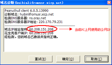 分配了動(dòng)態(tài)域名huibinlifromusr.xicp.net,右鍵后點(diǎn)擊“域名診斷”,相關(guān)信息如下