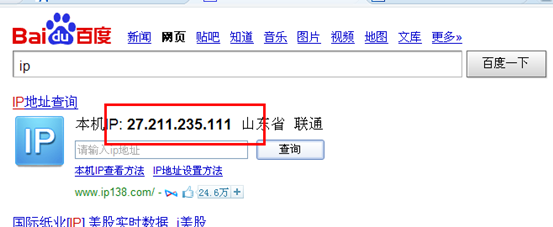 1) 如果您只是想測(cè)試一下,可以不用申請(qǐng)動(dòng)態(tài)域名,直接用自己當(dāng)前的動(dòng)態(tài)IP即可。像這樣查一下自己的當(dāng)前IP。其中可以看到自己的當(dāng)前公網(wǎng)IP為27.211.235.111(這個(gè)IP是動(dòng)態(tài)的,對(duì)應(yīng)上面申請(qǐng)的域名)。