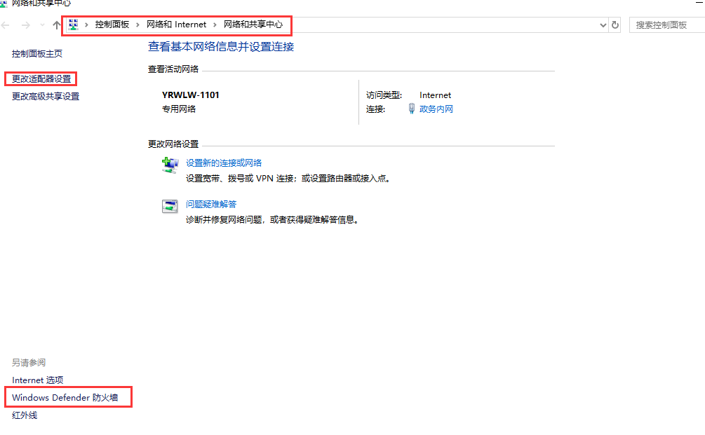2. 按路徑:控制面板》網(wǎng)絡(luò)和Internet》網(wǎng)絡(luò)和共享中心找到“windows防火墻”和“更改適配器設(shè)置”選項(xiàng),關(guān)閉防火墻并禁用與本次測試無關(guān)的網(wǎng)卡。并關(guān)閉電腦殺毒軟件。