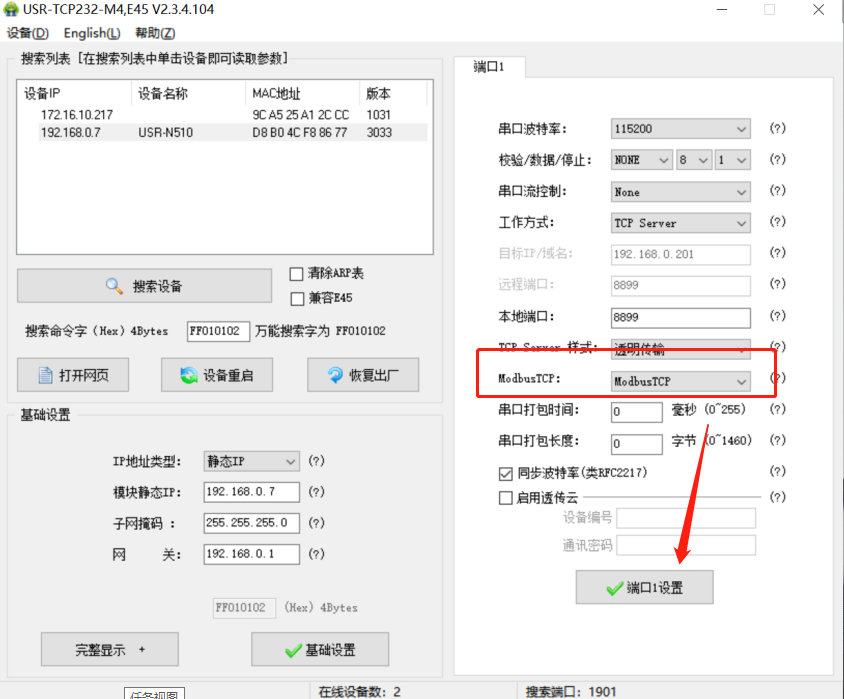 5. 下圖中使能modbus TCP功能,設(shè)置完成后,重新搜索一次,確認(rèn)參數(shù)是否修改成功
