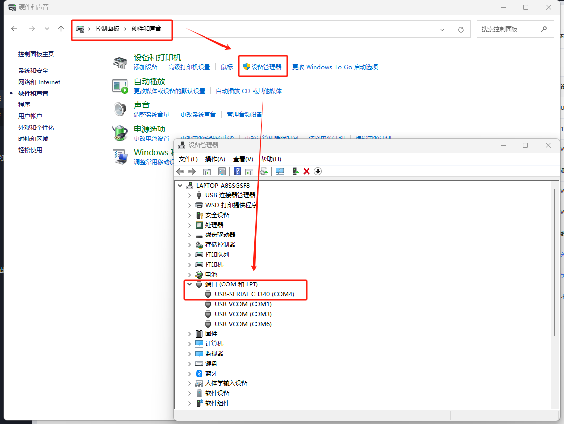 控制面板---硬件和聲音---設(shè)備管理器---COM和LPT,確認(rèn)USB轉(zhuǎn)換器的COM口是COM4