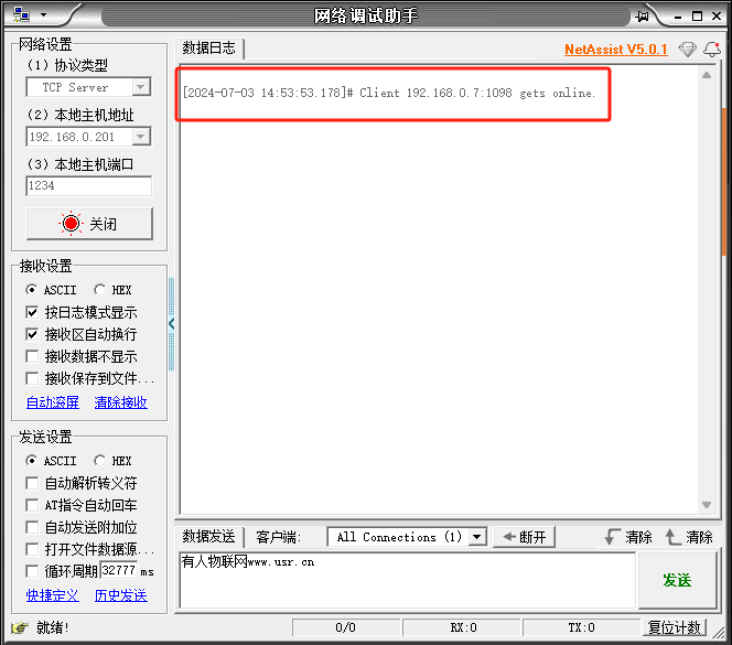 網(wǎng)絡(luò)調(diào)試助手端監(jiān)測(cè)到TCP Client設(shè)備接入