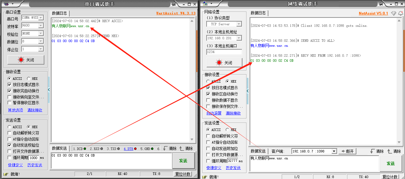 打開一個(gè)串口調(diào)試助手引用COM4,串口參數(shù)選擇9600、NONE、8、1,網(wǎng)絡(luò)調(diào)試助手和串口調(diào)試助手互發(fā)數(shù)據(jù)進(jìn)行測(cè)試。