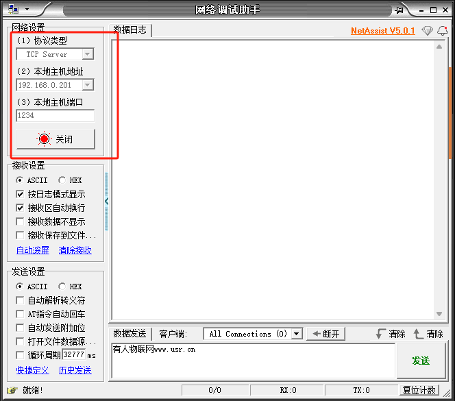 打開一個(gè)網(wǎng)絡(luò)調(diào)試助手,選擇TCP server模式,本地主機(jī)192.168.0.201,本地端口號(hào)1234