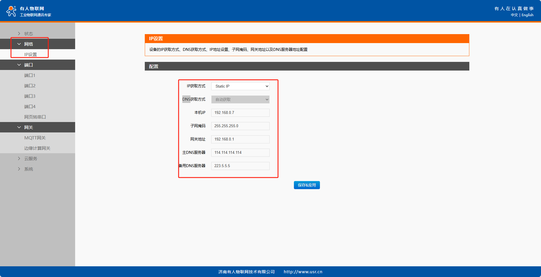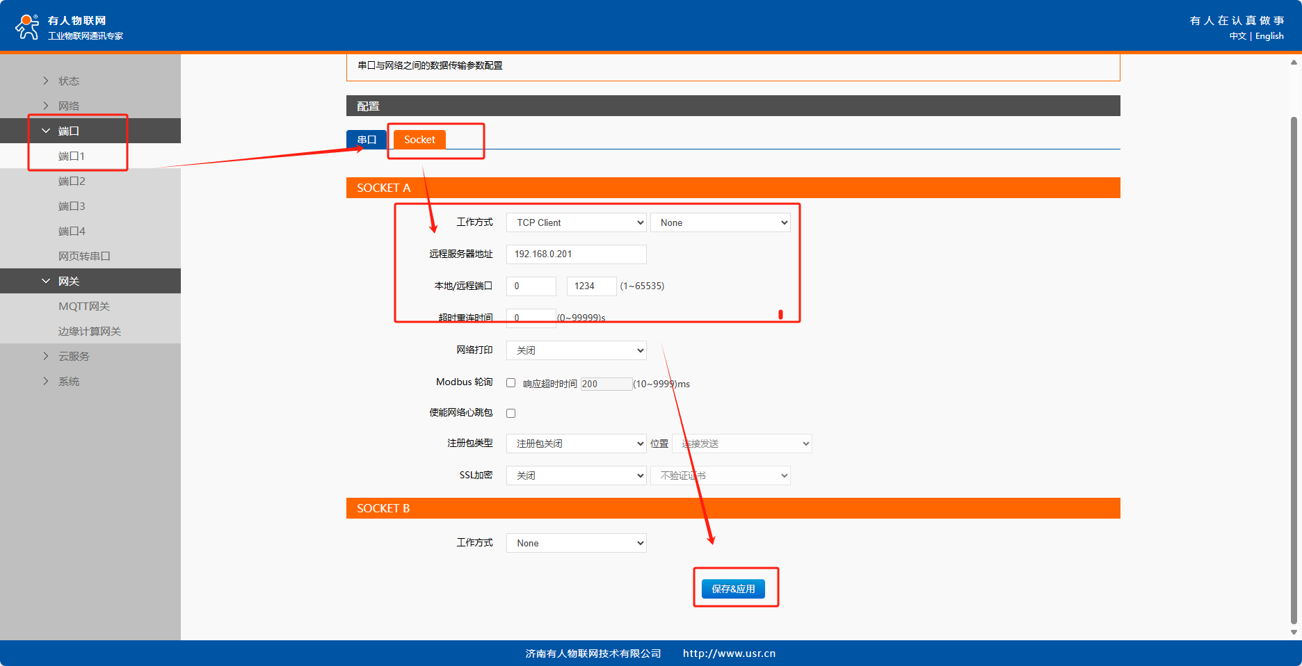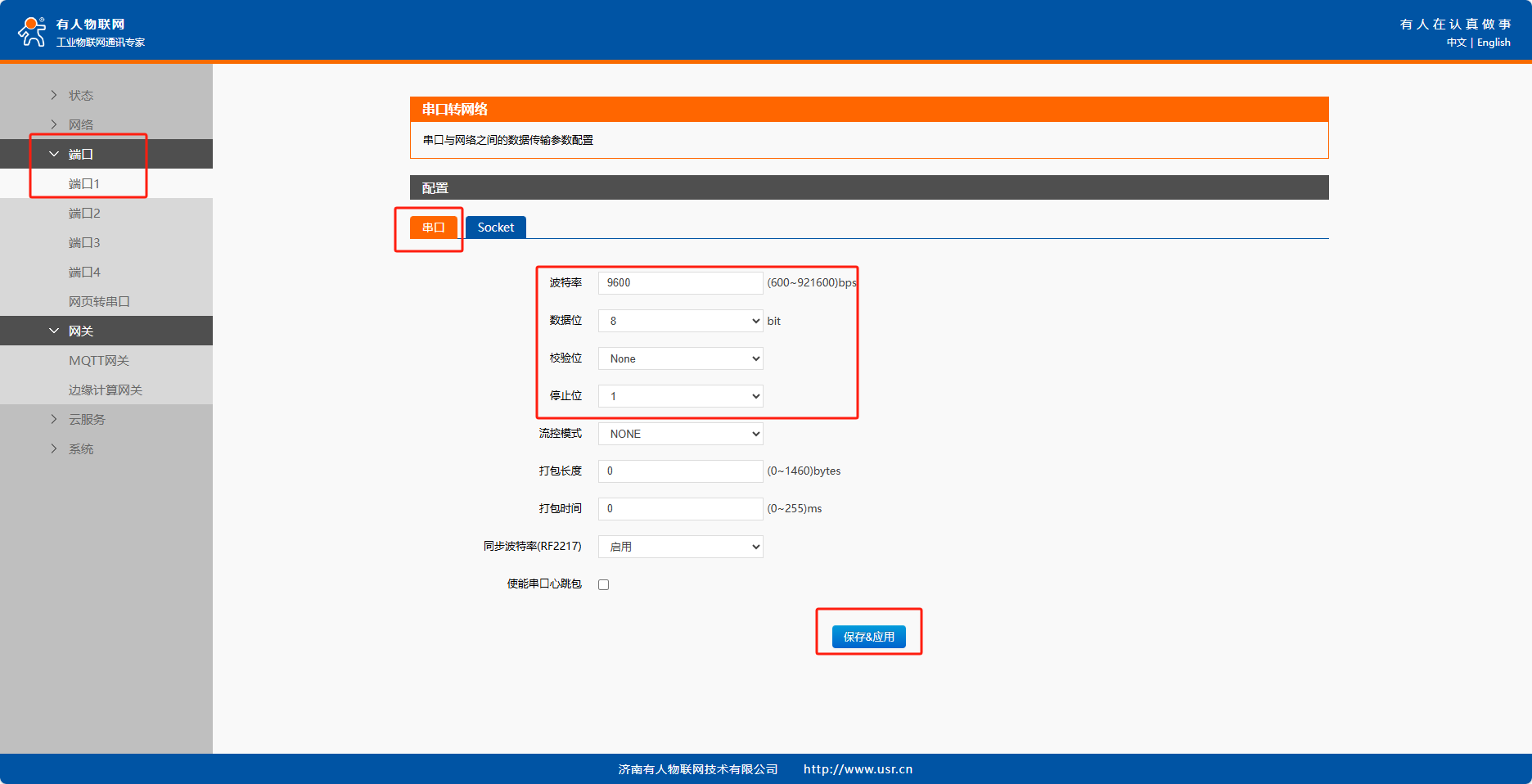 端口---端口1---串口,將串口參數(shù)修改為9600、NONE、8、1,保存應(yīng)用,繼續(xù)配置
