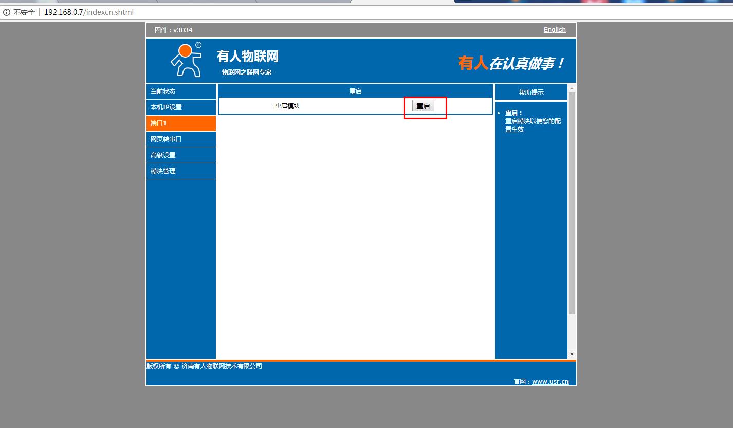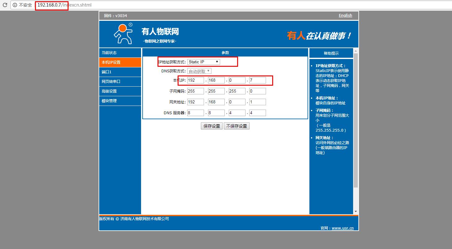 在電腦打開瀏覽器,輸入靜態(tài)IP192.168.0.7 登錄USR-N510的內(nèi)置網(wǎng)頁。