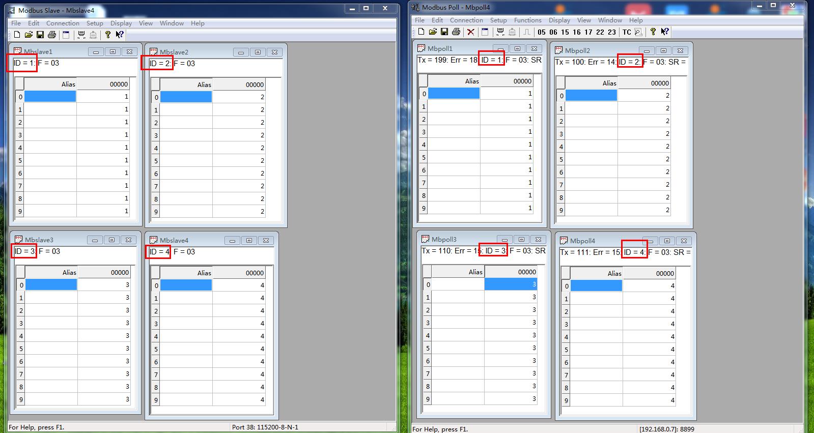 MODBUS SLAVE軟件添加4個SLAVE ID,依次是ID 1 ID 2 ID 3 ID 4。