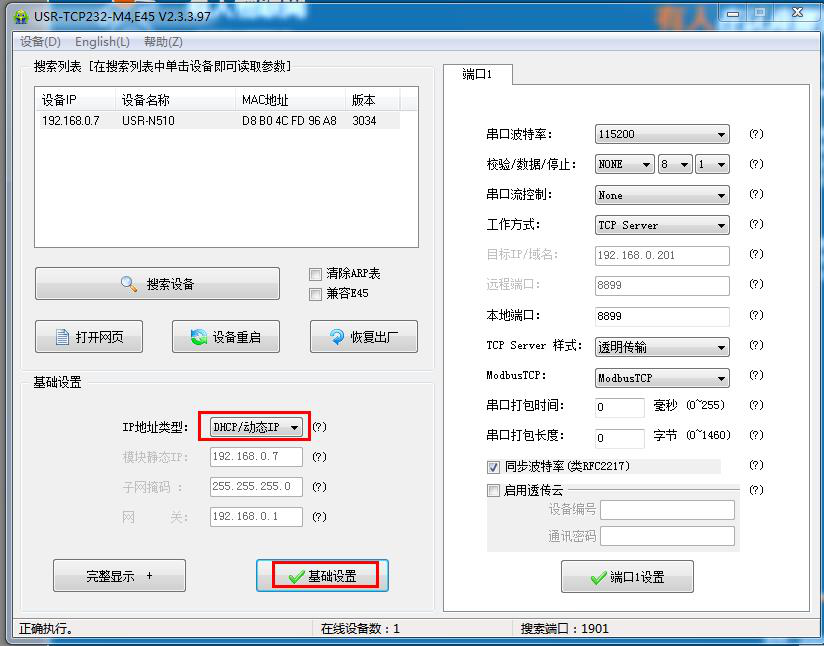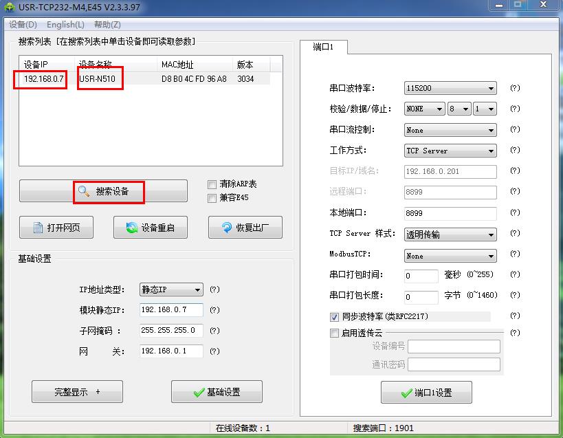 用M4設置軟件搜索USR-N510的IP。確認是192.168.0.7
