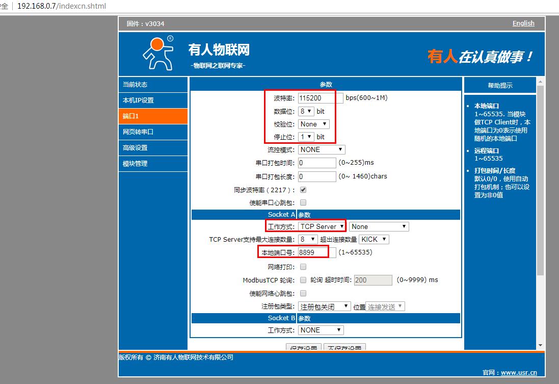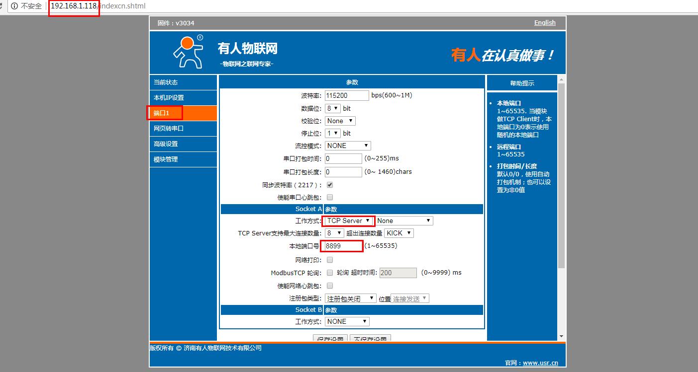 網頁檢查串口參數(shù),工作方式設置TCP server,本地端口號默認是8899