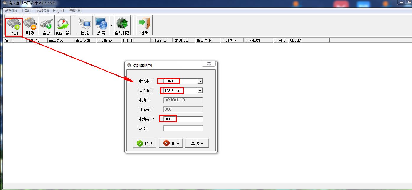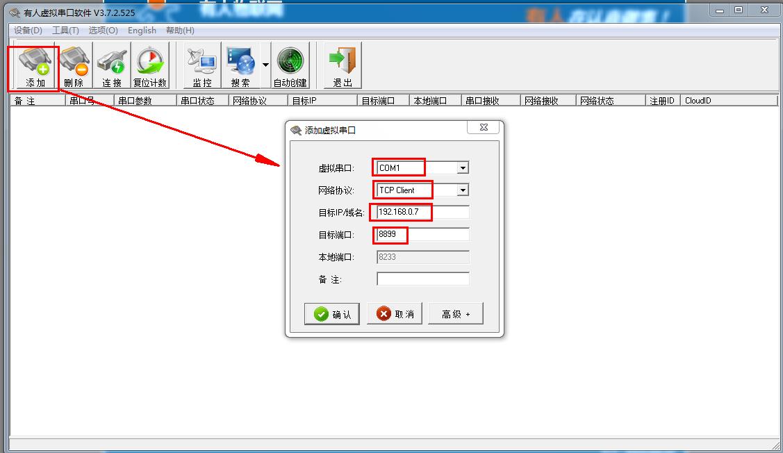 虛擬串口軟件手動添加一個COM1,網絡協(xié)議設置TCP client,目標IP填192.168.0.7,目標端口填8899。