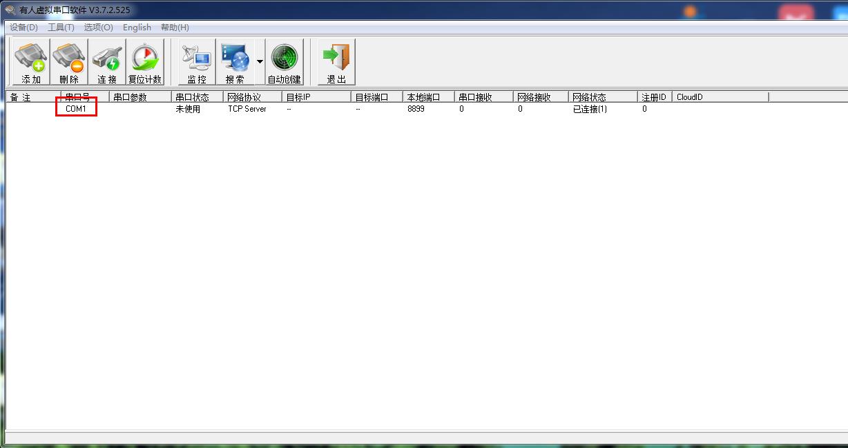 虛擬串口軟件手動添加一個COM1,網絡協(xié)議設置TCP server,本地端口填8899。