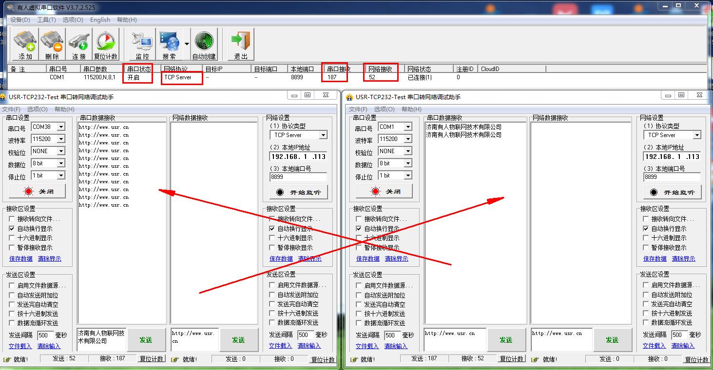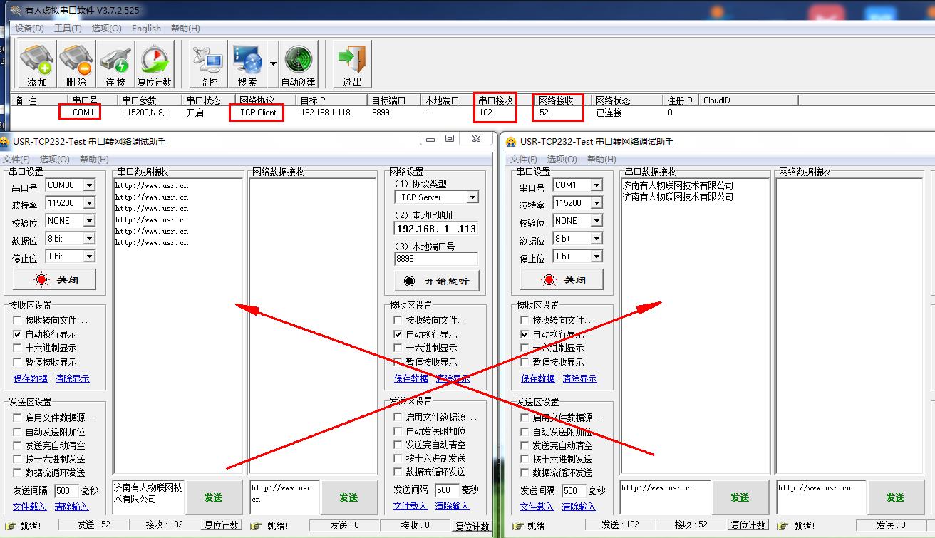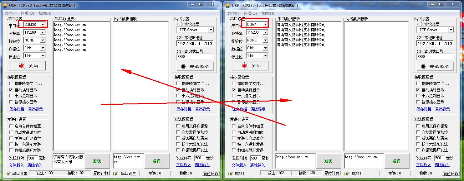 在電腦上,打開2個串口助手,USR-TCP232-TEST軟件。