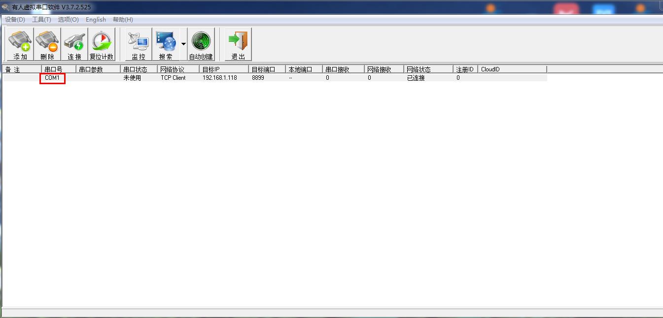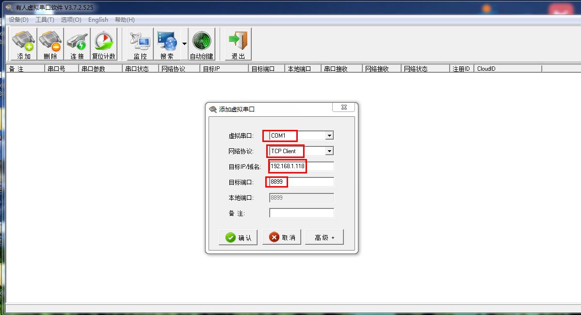 虛擬串口軟件手動添加一個COM1,網絡協(xié)議設置TCP client,目標IP填192.168.1.118,目標端口填8899。