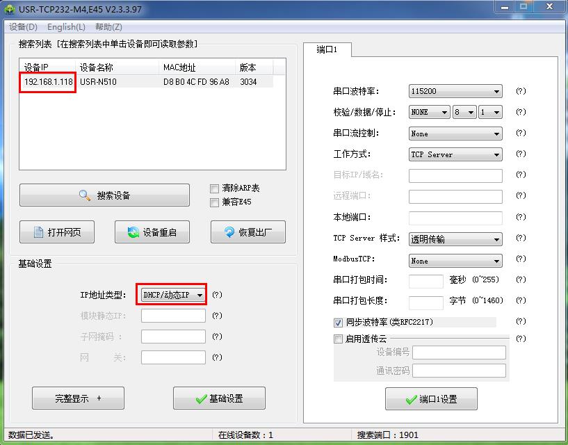 用M4設置軟件搜索USR-N510的IP 192.168.1.118