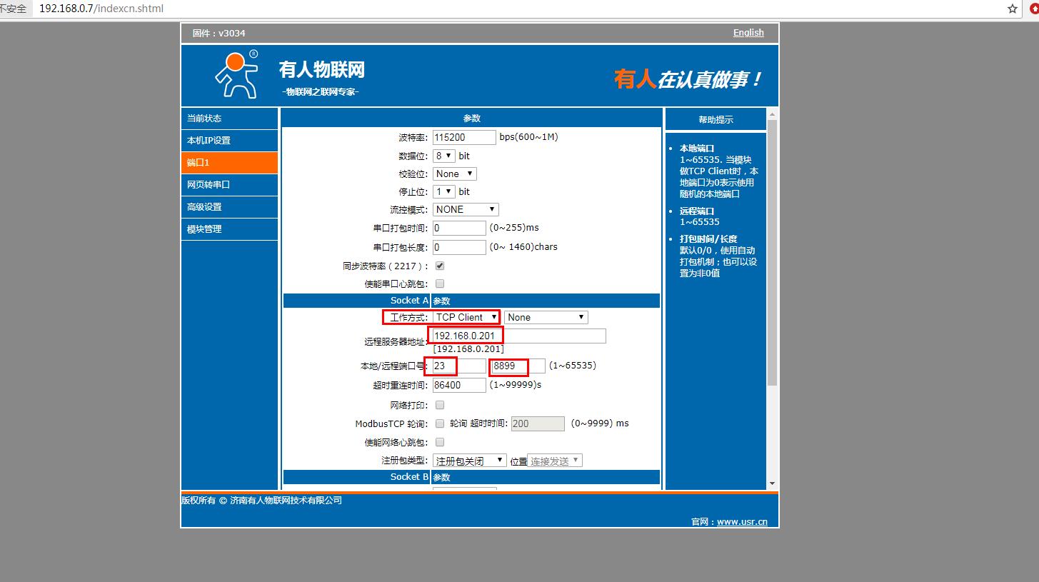 網頁檢查串口參數(shù),工作方式設置TCP client,本地端口號設置23,遠程端口設置8899,本地端口不要設置和其他端口重復。本地端口也可以設置為0,建立TCP連接后,本地端口是隨機分配的。遠程服務器地址填虛擬串口軟件所在電腦的IP。192.168.0.201