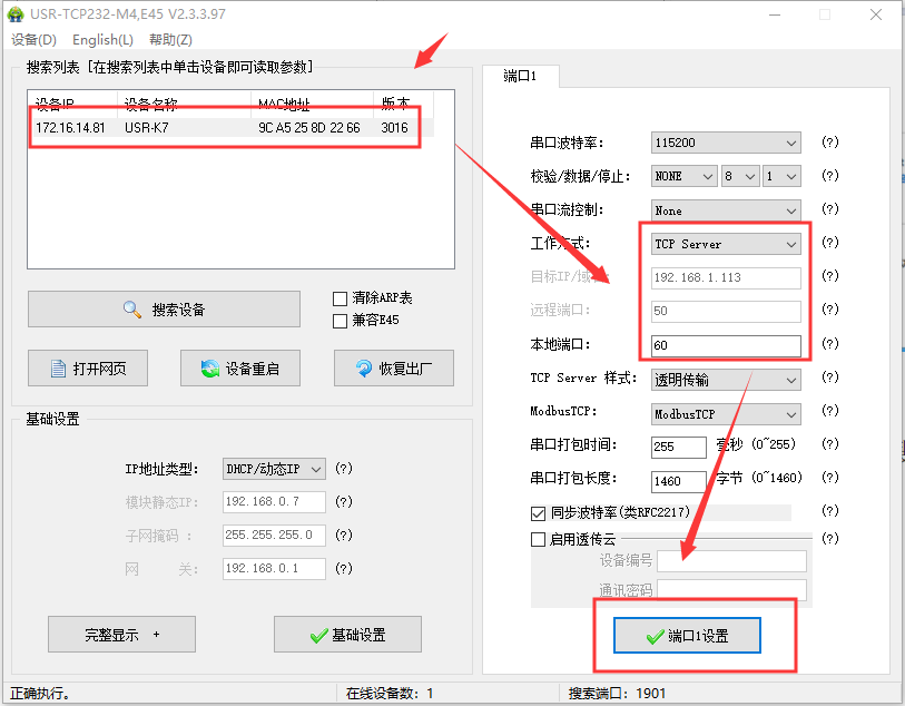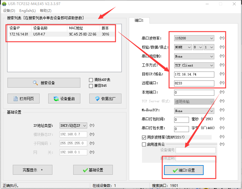 點擊“搜索設(shè)備”,當(dāng)搜索列表中出現(xiàn)K7的設(shè)備后,單擊搜索到的設(shè)備,設(shè)置配置信息并保存(動態(tài)IP)